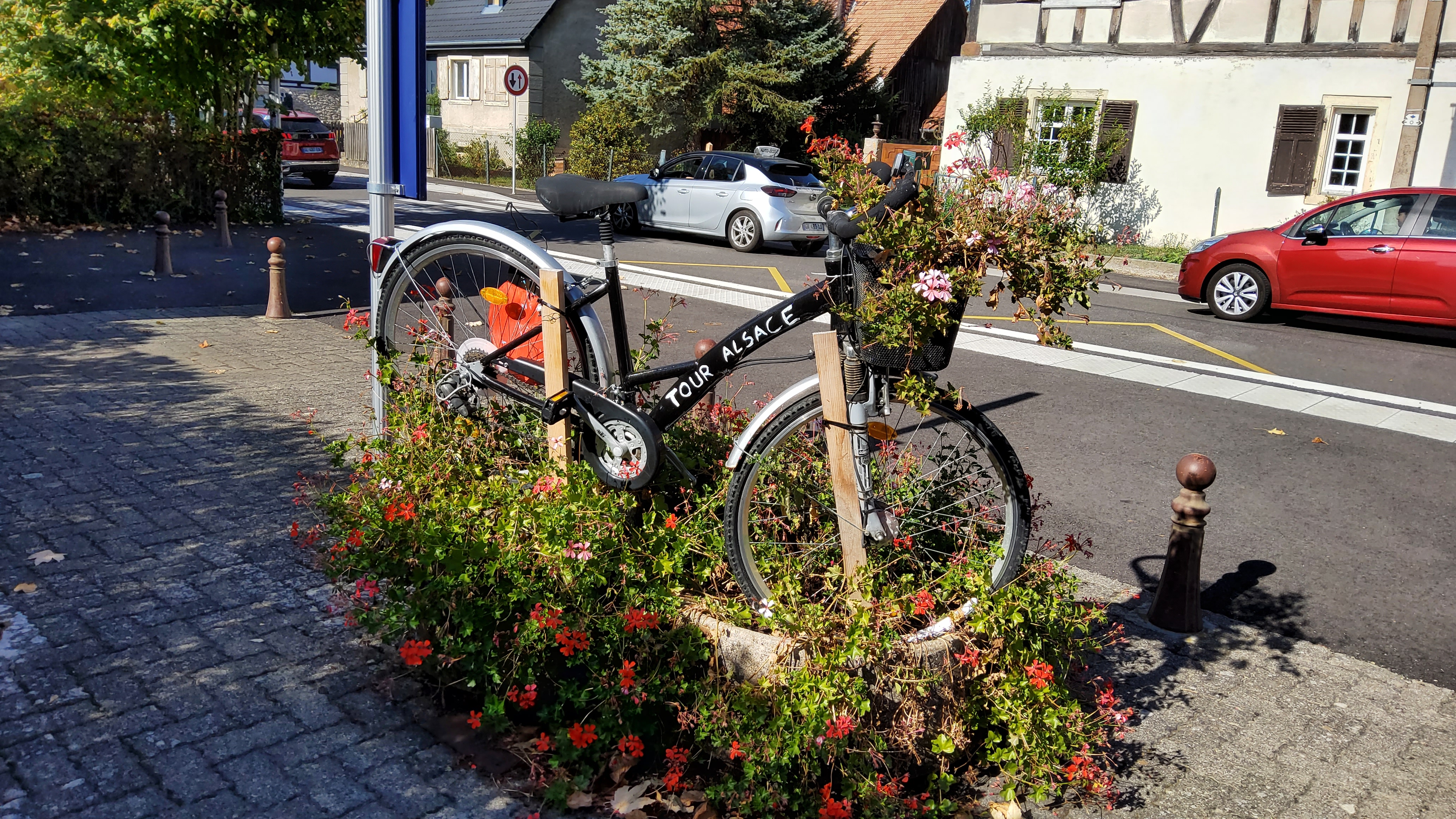 Der letzte heiße Tag des oktoberlichen Altweibersommers (schöner ist der Ausdruck Indian summer) zwang mich zu einer Fahrrad-Ausfahrt: 100 Kilometer, drei Länder. Dass es ein ominöser Freitag der Dreizehnte war, hielt mich nicht davon ab — und es waren auch viele andere unterwegs in Frankreich, in der Mehrzahl Rennradfahrer.
