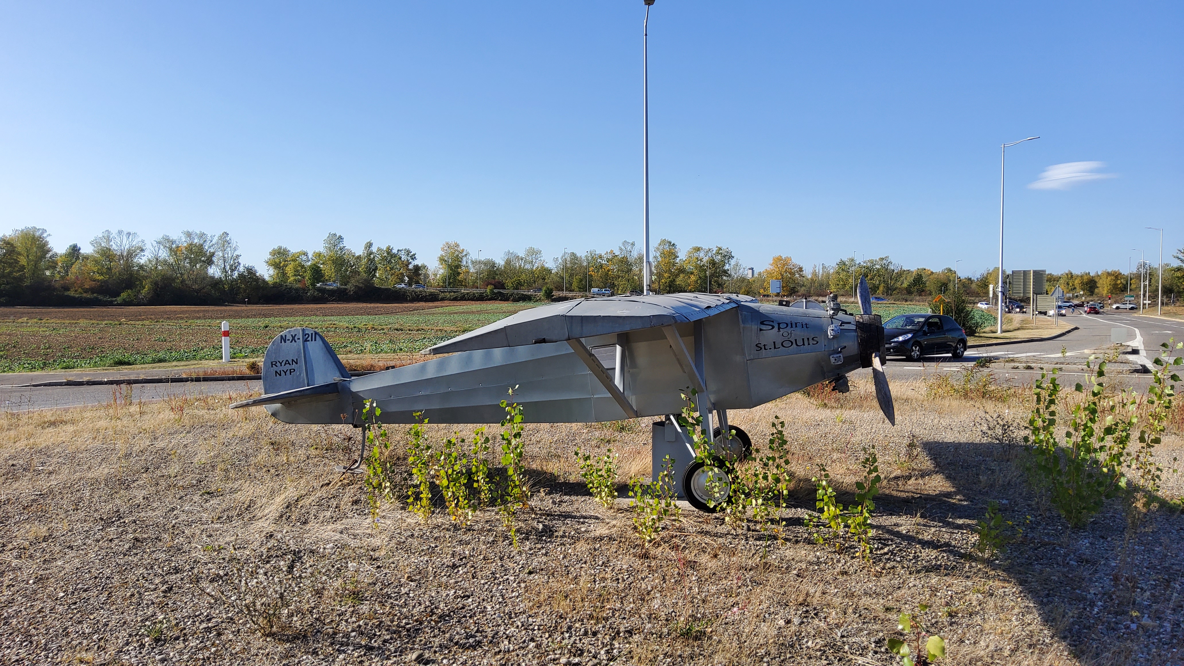 In St. Louis steht auf einem Kreisel dieses Flugzeug, das „Spirit of St. Louis“ heißt. Das war die kleine Maschine, mit der Charles Lindbergh am 20. Mai 1927 über den Atlantik flog. Die Geldgeber kamen aus St. Louis im Bundesstaat Missouri.