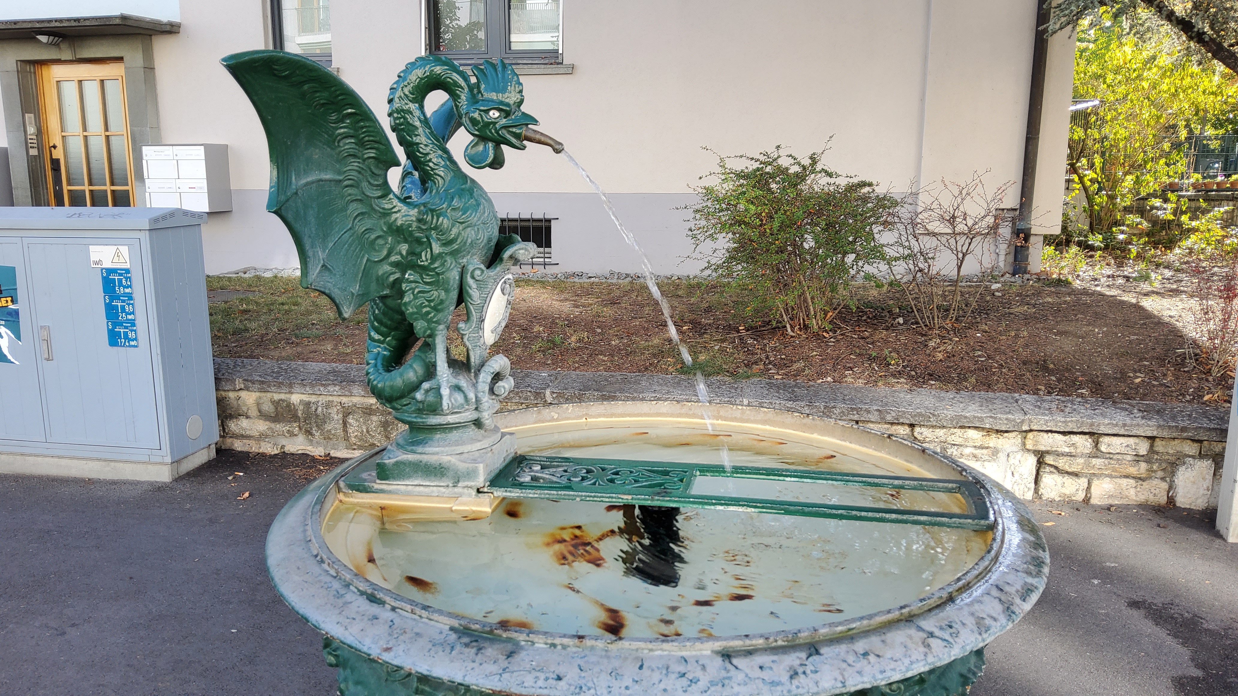 Endlich mal wieder in Basel. Der Vogel Gryff ist das Wahrzeichen der Stadt. Und endlich wieder ein Brunnen! Im Elsass sind sie leider selten.