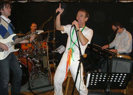 Ich als Leadsänger an meinem 50. Geburtstag in Landsberg am Lech. Hinten Cousin Reinhard als Drummer