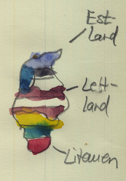 Agrita, eine nette Kollegin, kam von einer Reise in ihr Heimatland Lettland zurück und drückte mir zwei Anstecker in die Hand: einen mit dem ganzen Baltikum. Der andere zeigte Lettland, Latvija, mit deren Fahne. Manchmal trage ich sie. Die drei Länder befreiten sich 1989 im Zuge des Zusammenbruchs des Ostblocks von der russischen Vorherrschaft und wurden unabhängig.