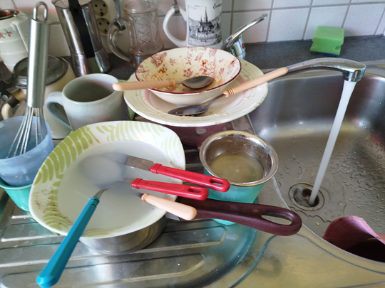 Meiner Ansicht nach kann die Vorstellung, Geschirrspülen sei unangenehm, eigentlich nur auftreten, wenn du den Abwasch stehen lässt. Sobald du an der Spüle stehst, die Ärmelhochkrempelst und die Hände in warmes Wasser tauchst, ist es eigentlich ganz angenehm. Es macht mir Spaß, mir mit jedem Geschirrstück Zeit zu lassen, wobei mir das Geschirr, das Wasser und die Bewegungen meiner Hände ganz bewusst sind. (…)