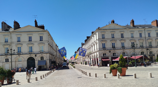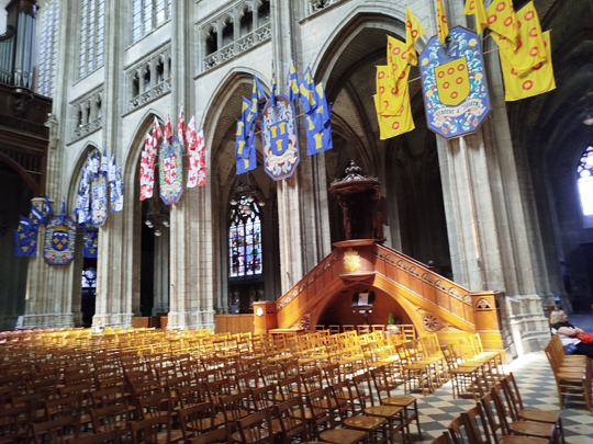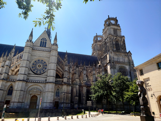 In Orléans gleich hin zur Kathedrale. Aber erst Pizza essen. Ich war die 45 Kilometer gefahren, ohne etwas zu mir zu nehmen (nur Wasser). Die Bedienung war eine nette Frau, wir redeten über Jeanne d’Arc, und ich stellte fest, dass genau heute ihr Gedenktag war! Am 30. Mai war sie hingerichtet worden. Exakt heute! (Ich hatte erst am Donnerstag, dann am Samstag fahren wollen.) Ein Bild von der Kathedrale, eins von innen (Fahnen haben sie eine Menge) und der Vorplatz mit Blick eine Straße entlang.