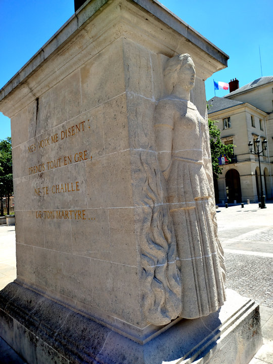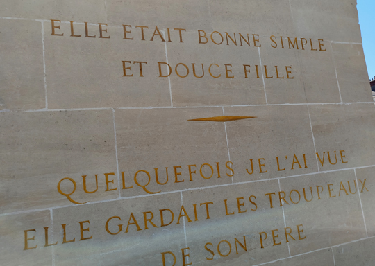 Das ist aus ihrer Gerichtsverhandlung. Danach heißt es aber noch: »Am Ende wirst du ins Königreich des Paradieses eingehen.« Das hat man sich erspart. Wäre schön gewesen, gerade vor der Kathedrale. Die zweite ist etwas nichtssagend: Sie sei ein braves Mädchen gewesen, und manchmal habe sie sogar die Herde des Vaters gehütet. Und dann noch eine Jeanne-d’Arc-Straße (in Chateauneuf-sur-Loire).