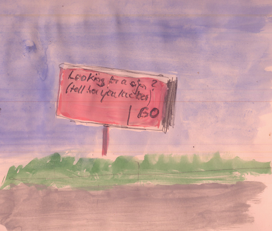 Als ich an dem Hotel vorbeifuhr, in dem er gestorben war, konnte ich es nicht ertragen, hinzusehen und blickte auf die andere Seite. Sofort zog mich eine Reklametafel an (a billboard). Ich habe bereits über einige Zeichen gesprochen, die ich von ihm bekam, doch dies war das Größte. Ich weiß, dass Leute sagen werden, hey, es ist doch bloß eine Reklametafel; aber wie groß ist die Wahrscheinlichkeit, dass ich gerade diese sehe, nur Stunden nachdem ich ihn um ein Zeichen gebeten hatte? Und es war genau gegenüber von dem Hotel, in dem er gestorben war. GENAU GEGENÜBER.