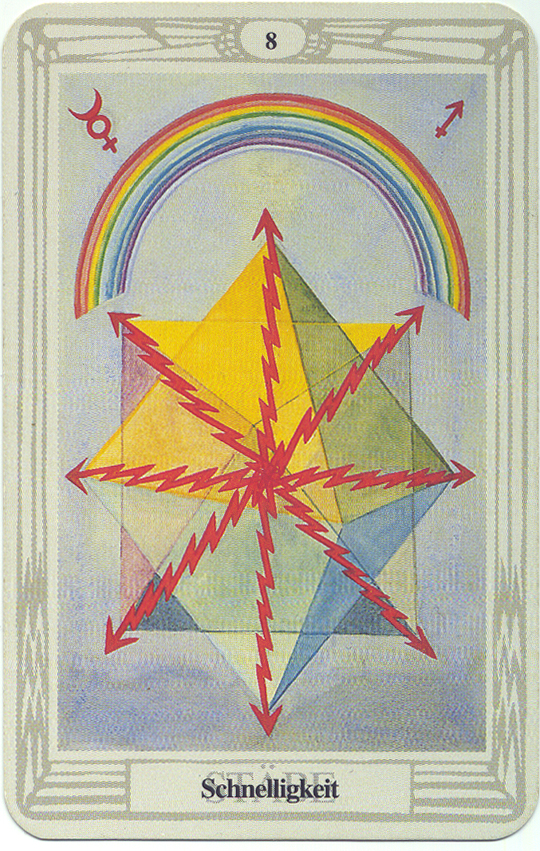 Vor meinem zweiten Versuch zog ich nach dreimaligem Ziehen eine Tarot-Karte: Es kam die Acht der Stäbe. Elektrizität, Scnelligkeit, neue Dynamik! Das klang gut. Die Karte sagt, was sein wird, doch was sein wird, geschieht nicht ohne mich. Wenn ich sitzenbleibe, wird sich keine Dynamik einstellen. So ist die Tarot-Karte zum einen eine Vorhersage, zum andern aber auch ein Appell: Mach mit! – Oder vergiss es.