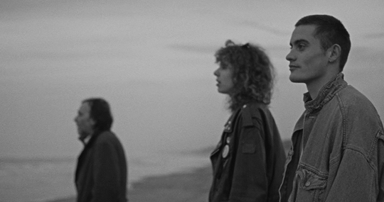 Besonders toll fand ich Un ciel si bas von Joachim Michaux (33 Minuten). Ein junger Mann (oben im Bild rechts) kommt im November 1989 nach Brüssel, um eine alte Freundin zu suchen. (Jemanden zu suchen ist ein beliebtes Motiv für eine filmisch geschilderte Reise: Es ist sozusagen der Hitchcocksche McGuffin.) Er trifft eine Lederbraut, die in einer Kneipe ausschenkt und einen englischen Journalisten, und die drei tanzen im Club und fahren ans Meer. Alles ist in körnigem Schwarz-Weiß gefilmt und verströmt das Verlorensein so überzeugend, dass ich an den jungen Wim Wenders und seine Filme aus den 1970-er Jahre erinnert wurde (Im Lauf der Zeit, Alice in den Städten). Stundenlang könnte ich mich so dahintreiben lassen. Die Darsteller: Maxime Thébault, Rosie Sommers, Damian McCall.