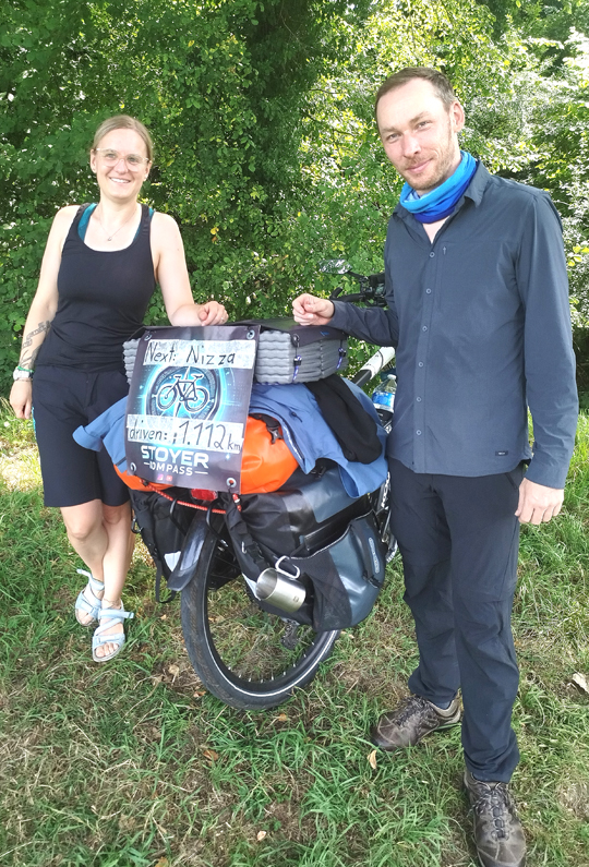 Sie kennen sich immerhin schon dreieinhalb Jahre und haben auf Youtube den Kanal Stoyerkompass, und ihr seht hier einen 22-minütigen Film über ihre ersten 7 Taga bis nach Dôle. In einem anderen Beitrag schildern sie, wie sie, schon unterwegs zum Nordkap, wieder umdrehten, weil ihr Hund nicht dazu zu bewegen war, in den Anhänger einzusteigen. Also nun nach Südwesten und ohne Hund. Was sie dabeihatten, stelle quasi ihre gesamte Habe dar, verrieten sie mir. Wünschen wir den beiden viel Glück!