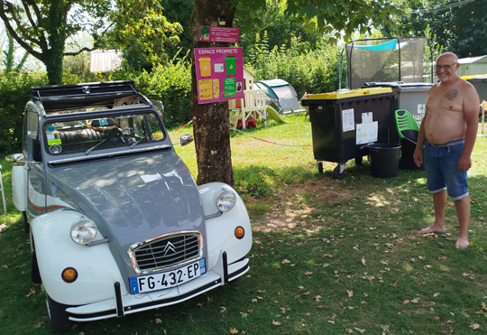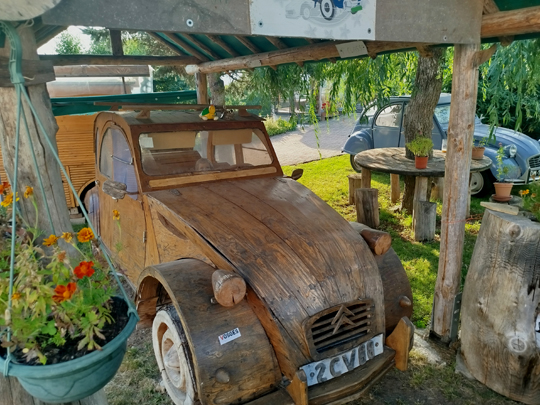 Ich erreichte meinen Lieblingscampingplatz und kam am folgenden Tag mit einem Franzosen ins Gespräch, der Zelt und Citroën 2 CV neben sich stehen hatte. Seine Frau war sehr nett und ihr kleiner Hund, der Üopa hieß oder so, erst 18 Monate alt und total verspielt. Immer wieder musste man ihm den grünen Ball werfen. Mit dem Döschewo, der in Deutschland Ente (canard) und in England escargot heißt, also »Schnecke«, waren sie 2024 bei einem Treffen in Slowenien mit 3000 Fahrzeugen dieses Typs!! Aus aller Welt kamen sie, und manche Besitzer werden Tage, wenn nicht Wochen für die Fahrt gebraucht haben. Der 2CV hat nur 27 PS und fährt vielleicht 90 Höchstgeschwindigkeit. Am Tag danach, kurz vor dem Campingplatz in Vagney bei Remiremont, erspähte ich in einem Garten eine »Ente« aus Holz. Hab ich fotografiert!