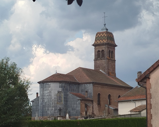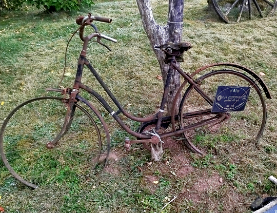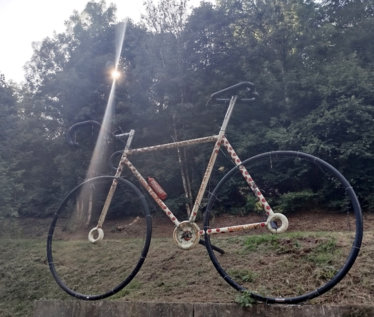 Von der Doubs-Insel war ich Richtung Norden gefahren, die Sonne knallte um 14 Uhr vom Himmel, ich fuhr nur nch Zeitlupe, und da hörte ich es grollen. Eine Wolkenwand bewegte sich auf uns zu, ich hielt in dem Ort Ecromagny an und wartete mal ab. Und so sah ich auf einer Wiese die Reste des Fahrrads, das der Pfarrer der Gemeinde bewegte hatte, die heute nur mehr 160 Einwohner hat. Vor 50 Jahren waren das sicher noch mehr.