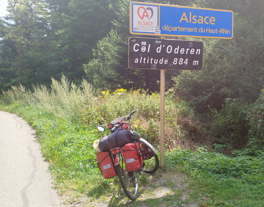 Und drunter mein Rad mit Gepäck auf dem Col d’Oderen, 884 Meter. Das war der nächste (und schon letzte) Tag. Ich war erschöpft gewesen am Vortag und fuhr etwas bangend dem Pass entgegen, der dann (wie oft in den Vogesen) eine eher gemächliche Steigung aufwies: 4 Prozent, vielleicht 5. Auch hier fuhr ich hoch in Zeitlupe im kleinsten Gang. Aber oben war ich dann, um 12 Uhr. Und dann noch 100 Kilometer heim auf den endlosen elsässischen Straßen, denn das Land ist flach. Um 9 Uhr losgefahren, um 20 Uhr zu Hause. Halleluja!