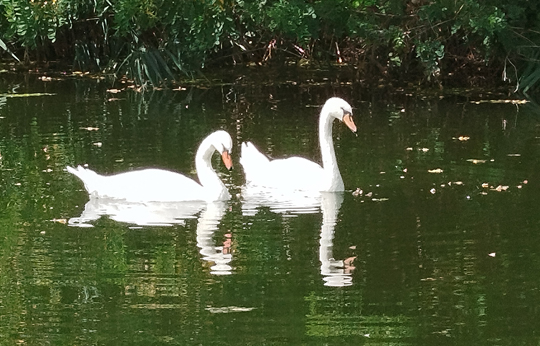 Wieder ein halbes Dutzend Reiher gesehen, und einer war nur zwei Meter weg. Wie majestätisch sie gehen! Derek Walcott hat ja über weiße Reiher geschrieben, die es in der Karibik gibt, und dass sie wissen, wie toll sie sind (knowing how well they look, strutting perfection), und dann fliegen sie … »launch themselves with wings that, beating faster, are certain as a seraph’s when they beat.« Die Seraphim waren Engel höchsten Ranges und hatten 3 Flügelpaare, mit den Cherubim werden sie meist zusammen erwähnt. Die Reiher, diese Segler, sind »seraphische Seelen«, schrieb ja Walcott. Darunter zwei Schwäne.