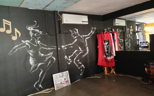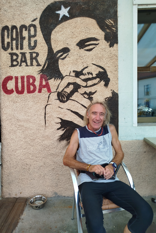 Im Cuba Café. Die Besitzerin lichtete mich vor Che ab. Darunter: die Bühne für Konzerte.