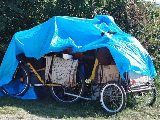 Vor einer Woche dann, beim Einkaufen in der Rheinebene, kam ich an einem Feld und an einem Obdachlosen vorbei, der sich vor der Sonne unter eine Plane gerettet hatte. Ich steckte ihm einen Schein zu. So macht man das, Donald!