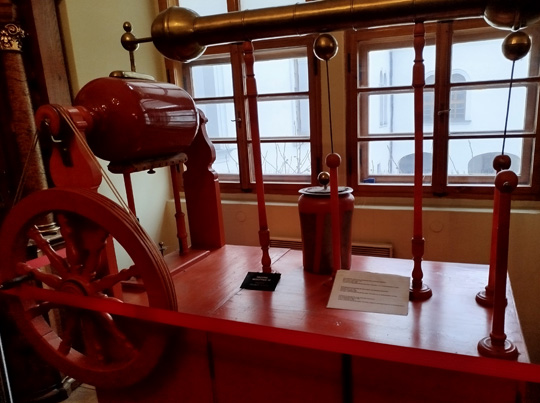 Elektrisiermachine von 1795, aufbewahrt in einem Kloster in einer Bibliothek in Prag. Man dreht das Rad links, und Funken sprühen