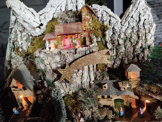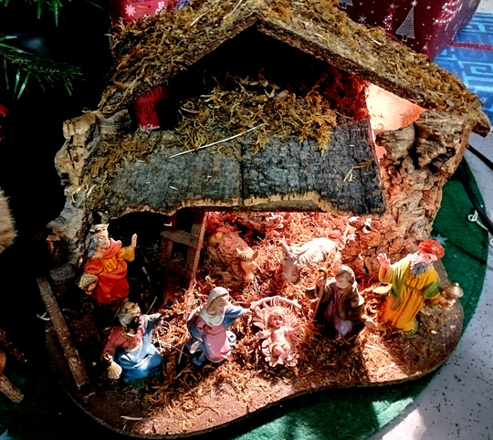 Man erkennt das heilige Paar und ihren kleinen Sohn nicht gut. Richtig wilde Landschaften wurden um die drei herumgebaut, als wäre das Kind in den bayerischen Alpen zur Welt gekommen. In einer großen Welt herrschen in einer kleinen Ecke Frieden und Eintracht, und wir halten es genauso. Der Friede in unseren Herzen soll hinausströmen in die Welt.