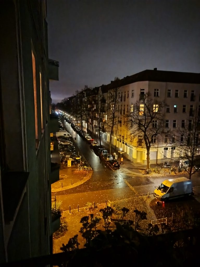 Beim Rauchen auf dem Balkon von Fritz, Nähe Treptow. Die Häuserzeile, die wir sehen, lag damals im Westen, die Mauer lief etwa auf dem gegenüberliegenden Bürgersteig dahin. Die Westler saßen mit dem Rücken zum Osten, denn zur Mauer hin waren die Toiletten und die Speisekammern untergebracht. Das Bild sieht natürlich viel spektakulärer aus als in Wirklichkeit. Kalt war’s und sehr ruhig.