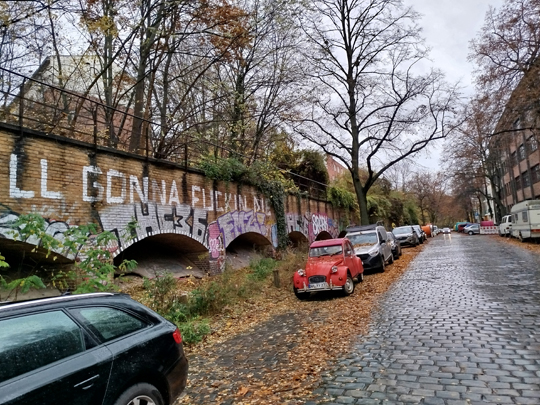 Und dann noch 3 Fotos von einem Spaziergang Richtung Friedrichshain. Da haben wir wieder Kopfsteinpflaster und einen Geschmack des alten Ostens, das alternative Berlin und einen Schuss Erotik noch …
