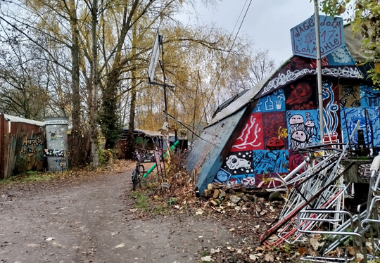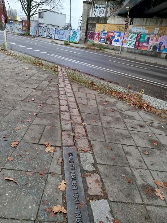 Von hier nach links gegangen, dann viele Kilometer rechts auf der Kiefholzstraße. Da finden wir noch eine Erinnerung. Da lief sie dahin, die Mauer.