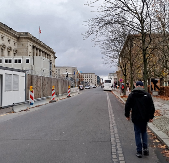 Und auch da, wo Fritz sich entfernt, sieht man, wo die Mauer stand. Links das Abgeordnetenhaus, rechts der Gropius-Bau.