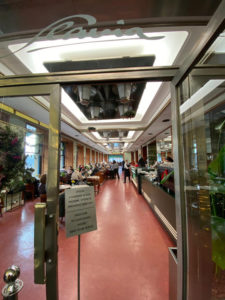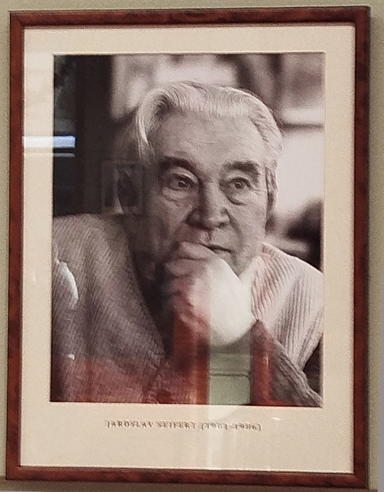Wir besuchten Anfang Januar das Café Slavia und mussten eine Vierrtelstunde wartzen, bis uns ein Platz zugewesen wurde: und er lag exakt auf der Höhe des Portraits von Seifert! Die Geheimtür von der Uferstraße fanden wir nicht. Das Café, das in den 1860-er Jahren eröffnet wurde, erhielt durch den Bau der Oper gegenüber 1884 eine neue Anziehungskraft. 1993 wurde es geschlossen und eröffnete wieder am 17. November 1997 – mit einem Abend für Jaroslav Seifert.
