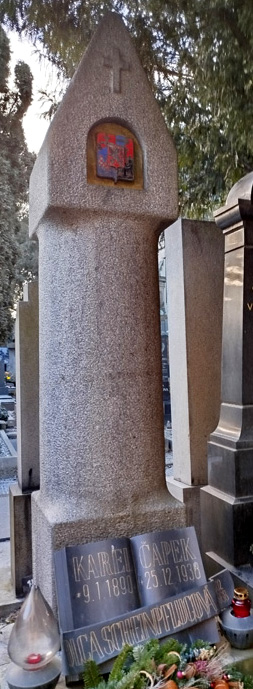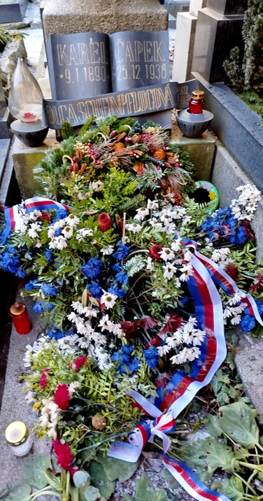 Herr Popel denkt an seinen Nachbarn, der gestorben ist mit noch nicht mal siebzig Jahren, und der Doktor hört ihn an und wirft dann ein, der Tote, dessen Namen nie genannt wird, habe ein Manuskript hinterlassen über sein Leben. (Links und rechts Bilder vom Grab Čapeks auf dem Vysehrad; nicht mal 50 ist er geworden.) Das bekommen wir also zu lesen. Der junge Mann war interessiert an der Dichtkunst, wurde dann aber Eisenbahner und betreute einige Bahnhöfe, zuletzt einen ganz kleinen, den er perfekt herrichtete. Der Verstorbene war verheiratet ohne Kinder und wurde nach dem Krieg Beamter, ein höherer noch dazu. Mehr müssen wir nicht wissen. Es liest sich gut. Doch dann, nach 70 Seiten, schreibt der Autor seiner Autobiografie plötzlich: