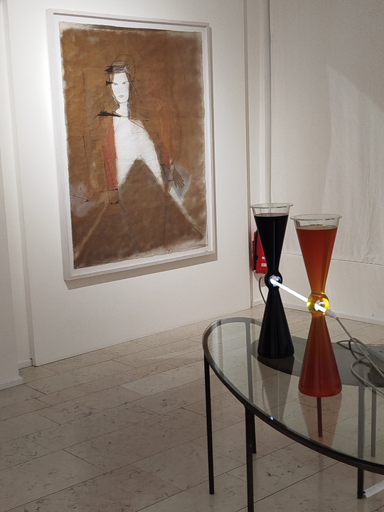 Bei einem Ausflug stieg ich aus dem Bus aus und stand plötzlich vor dem italienischen Kulturinstitut der Stadt. Es gab eine Ausstellung von Mario und Marisa Merz, und ich war dort. Und weil die Künstlerin ein Selbstbildnis und zwei Flüssigkeitsbehälter edlen Aussehens aufbot, dachte ich an die Alchemie und fotografierte es. Ansonsten: Auch Kochen ist Alchemie. Aus Zutaten entsteht durch Eindampfen und Brutzeln etwas Neues, Nährendes, Geniales. Die Alchemisten von früher wären heute gewiss Sterneköche. – Es gab aber auch einmal eine Frau unter ihnen, Maria die Alchemistin, der Link steht unten. In dem Beitrag über sie werden die Prinzipien der Alchemie näher erläutert.
