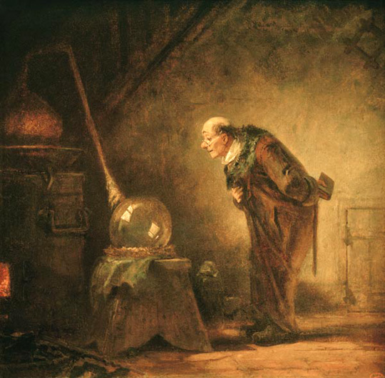 Unten sehen wir einen Alchemisten, wie ihn uns Carl Spitzweg 1840 zeigte. Das ist nicht der übliche bärtige Dunkelmann, sondern ein bürgerlicher Alchemist, der im Schlafrock vom Stein der Weisen träumt. Spitzwegs Gestalten wirken immer etwas dümmlich.