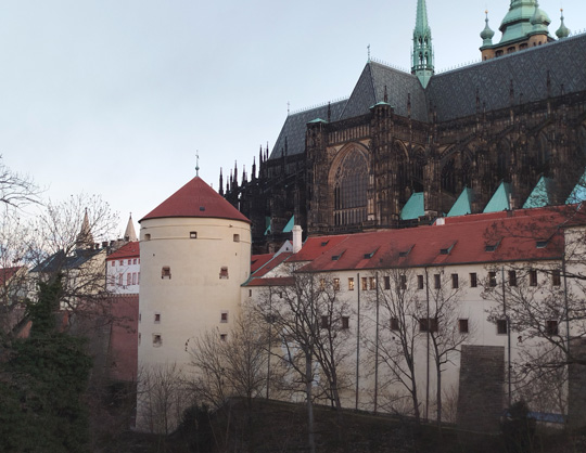 Wir schauen uns noch ein paar Bilder an, so die Burg (Hrad) auf dem Hradschin unterhalb des Veitsdoms, wo Rudolf hinuntersah auf die Moldau und seine Pferde striegelte und streichelte. Den Veitsdom fing übrigens Kaiser Karl IV. an, der neben Rudolf in Prag auch noch verehrt wird.