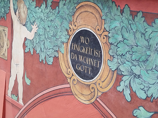 Unten noch der prächtige Innenhof des Rathauses, ein Engelreigen oberhalb des Eingangs zum Münster und Alt und Neu: Blick auf zwei Hochhäuser vom Petersberg. Zum Schluss ein kluger Spruch, den wir mitnehmen können im Geiste.