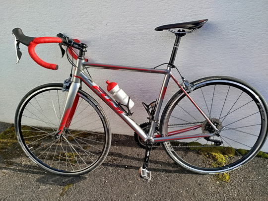 Ich hab’s in Sulzburg bei Harald Glaser entdeckt, und es war (fast) Liebe auf den ersten Blick. Nicht mehr die teuren Campagnolo-Teile hat es, sondern Shimano 105, außerdem die simplen Felgenbremsen. Liegt gut auf der Straße; so ein Rad braucht man, wenn man Berge hinunterfahren will!