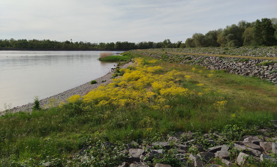 Mein derzeitiger Rückzugsraum: Bucht 9 am Rhein-Kanal mit Sandstrand und Schwänen, nun schön bewachsen mit Raps